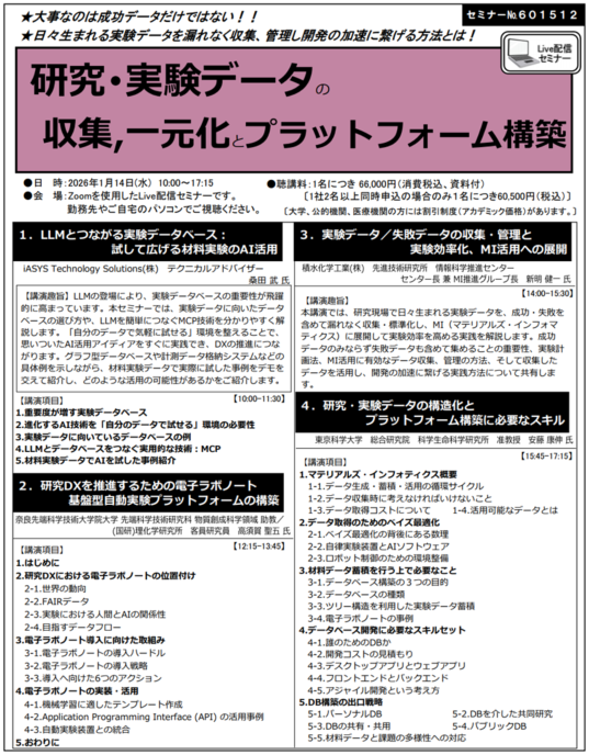 ・セミナー名:「研究・実験データの収集、一元化とプラットフォーム構築」